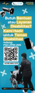 X-Banner yang menampilkan layanan penting terkait kebutuhan disabilitas di UNS, termasuk layanan call center PSD LPPM UNS, informasi layanan pengaduan/permohonan QR Code, serta kampanye pesan “Kami Hadir untuk Teman Disabilitas” yang menandakan komitmen UNS sebagai kampus yang inklusif dan responsif.