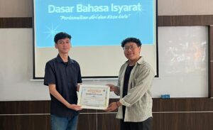 Sesi kedua diisi oleh Muhammad Efendy Dela Costa, yang memberikan pengenalan bahasa isyarat serta teknik komunikasi dasar untuk berinteraksi dengan mahasiswa Tuli. Peserta memperoleh pengalaman praktik langsung berupa pengenalan alfabet jari dan pemahaman dasar yang relevan dalam aktivitas PKKMB.