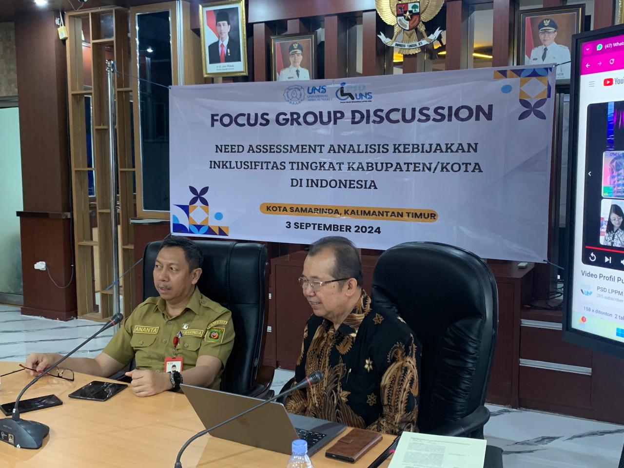 Kota Samarinda, 3 September 2024 – Pusat Studi Difabilitas (PSD) Lembaga Penelitian dan Pengabdian Masyarakat (LPPM) Universitas Sebelas Maret (UNS) melanjutkan rangkaian penelitian nasional bertajuk “Analisis Kebijakan Pembangunan Inklusif untuk Mendukung Perumusan Roadmap Kebijakan Inklusif Disabilitas pada Pemerintah Daerah Tingkat Kabupaten/Kota di Beberapa Provinsi di Indonesia.” Salah satu lokasi penelitian adalah Kota Samarinda, yang dikunjungi pada 3 September 2024. Tim peneliti PSD LPPM UNS terdiri atas Prof. Dr. Munawir Yusuf, M.Psi., dan Redydian Adhitya Nugraha, S.Psi., M.A. Kunjungan ini berlangsung di Kantor Pemerintah Kota Samarinda dengan melibatkan perwakilan perangkat daerah yang menangani isu sosial, pendidikan, ketenagakerjaan, dan perencanaan pembangunan.